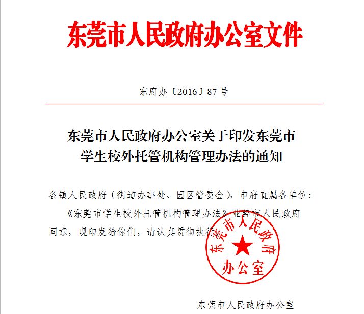 东莞市人民政府办公室关于印发东莞市学生校外托管机构管理办法的通知