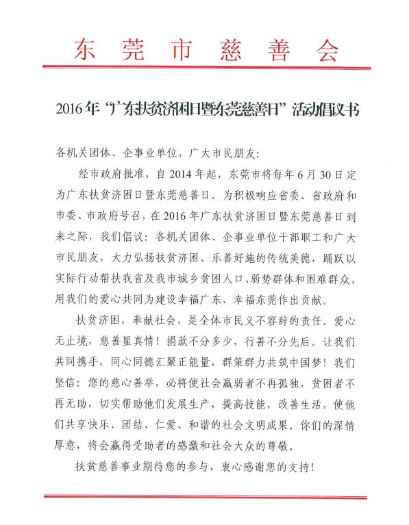 2016年“广东扶贫济困日暨东莞慈善日”活动倡议书