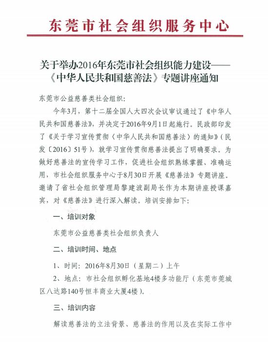 关于举办2016年东莞市社会组织能力建设——《中华人民共和国慈善法》专题讲座通知