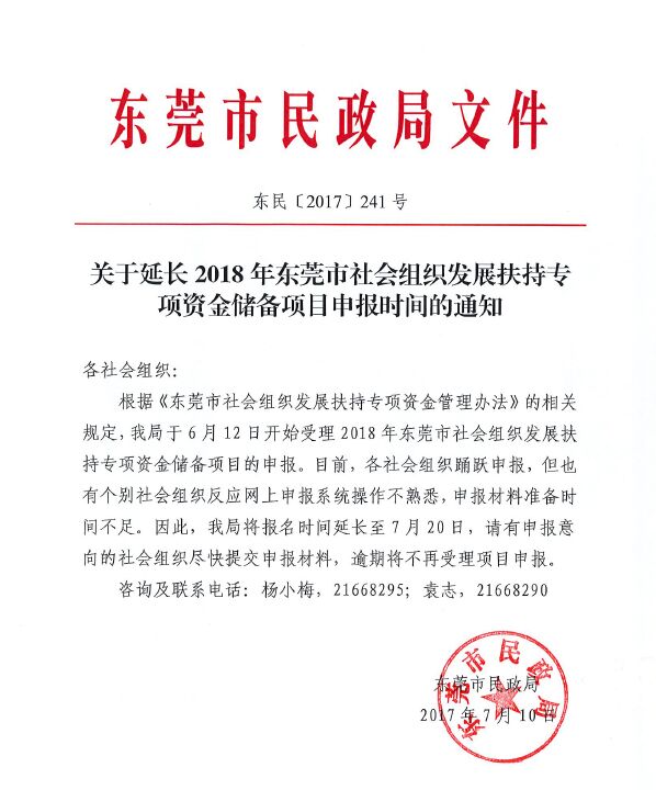 关于延长2018年东莞市社会组织发展扶持专项资金储备项目申报时间的通知
