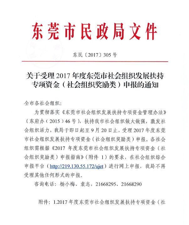 关于受理2017年度东莞市社会组织发展扶持专项资金(社会组织奖励类)申报的通知