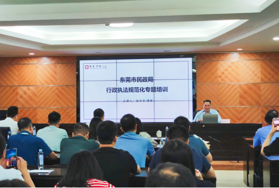 会议分两部分进行,第一部分由广东华商(东莞)律师事务所伍年华律师以行政执法规范化为主题,从“行政执法三项制度”的发展沿革,行政处罚的重点与难点解析和行政执法案卷评查常见问题进行了授课。第二部分市镇两级交流了授权事项运行情况,特别是办案执法中遇到的困难与解决路径。