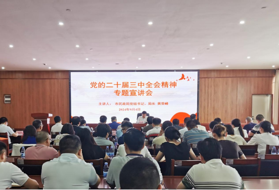 9月4日上午,东莞市民政局召开学习宣传贯彻党的二十届三中全会精神专题宣讲会。东莞市委宣讲团成员、市民政局党组书记、局长黄荣峰作宣讲报告。市民政局全体党员干部职工,下属单位中层以上党员干部100余人参加了会议。