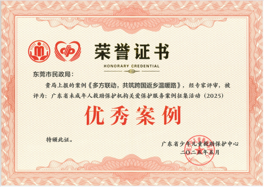 近日,广东省未成年人救助保护机构关爱保护服务“基层优秀关爱服务案例”在广东省2025年“润心伴成长 同心护未来”“六一”国际儿童节关爱服务系列活动的现场发布,由新葡京赌场 报送的《多方联动,共筑跨国返乡温暖路》服务案例荣获“优秀案例”。