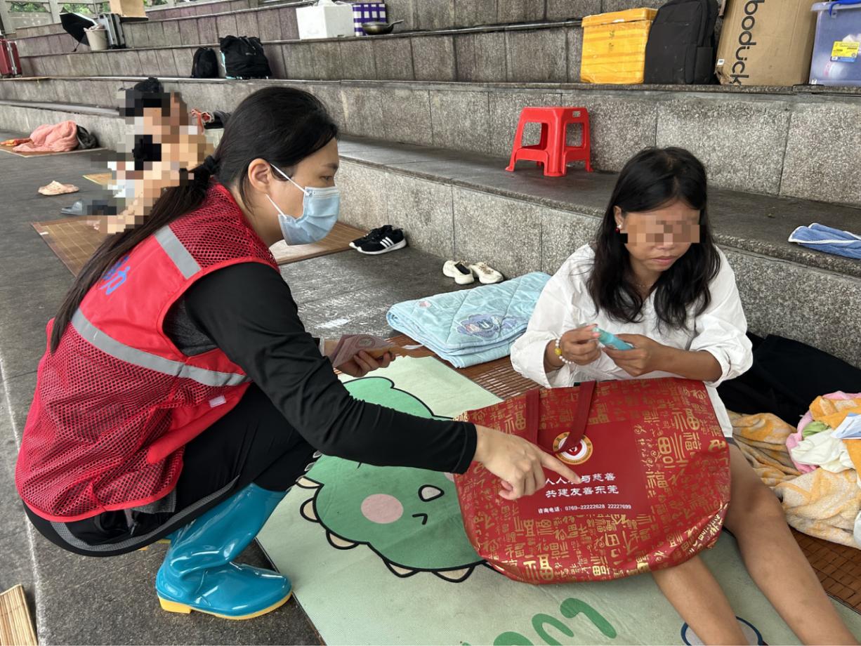 84日晚,特大暴雨突袭我市,全市拉响暴雨红色、橙色预警,街面生活无着流浪人员的安危牵动着民政人的心!85日,市民政局三级调研员、市慈善会常务副会长艾树珍带领市救助管理站、市慈善会工作人员,会同各镇街公共服务办、双百社工和爱心志愿者,在全市范围内开展街面巡查救助行动,劝导街面流浪人员进站求助或前往高处避险,结合近期“登革热和基孔肯雅热”疫情,给流浪人员发放防蚊爱心包,普及防蚊知识。