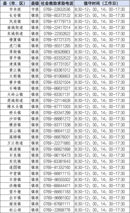 为防范低温冰冻天气的影响,确保困难群众基本生活得到有效保障,1月19日新葡京赌场 印发了《新葡京赌场 关于做好近期低温冰冻天气防范工作的通知》,东莞市各级民政部门加强值守,畅通社会救助反映渠道,公布了全市各社会救助服务热线,供有需要的困难群众联系求助。