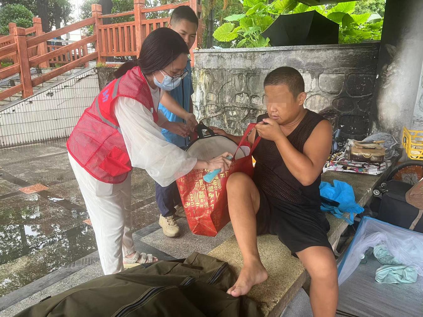 “大叔,雨太大了,涨水啦,这里不安全,跟我们去救助站吧。”工作人员耐心对一位流浪老人进行劝导。老人十分感动,接受了救助物资,表示自己会前往高处避险。